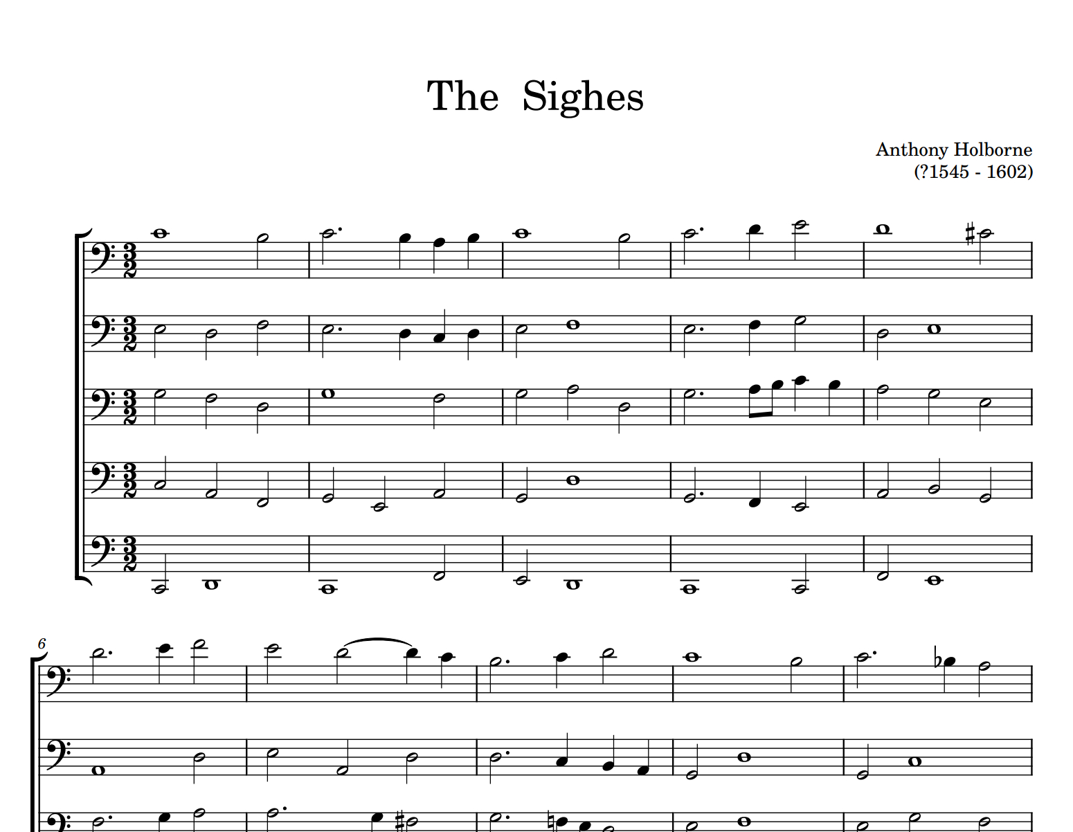 This 5-part galliard is a swinging party of a piece. The triple meter and many dotted rhythms are challenging, especially for the inner parts. But if you rely on the steady bass to navigate you, you'll discover its charms. Make sure you keep the tempo up so as to preserve its perky flow!